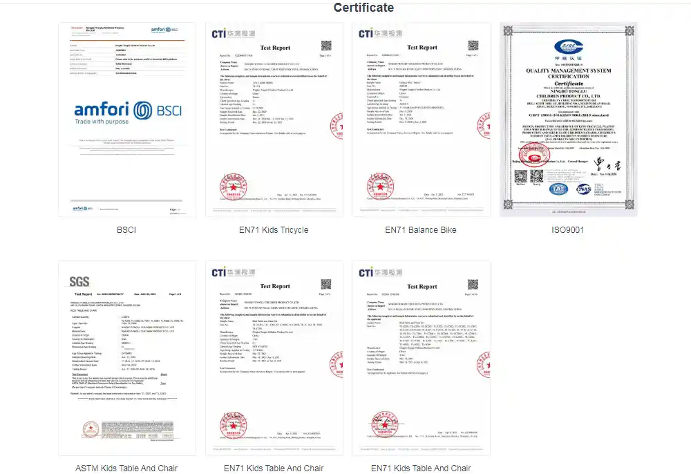 Πιστοποιήσεις όπως π.χEN71καιASTMδείχνουν ότι μαςπαιδάκια και νήπια τρικ η for έχει υποβληθεί σε εξειδικευμένες δοκιμές όσον αφορά το εάν τα υλικά είναι μη τοξικά, εάν οι γωνίες θα κόψουν τα χέρια και εάν τα εξαρτήματα είναι σταθερά, και έχει τηρήσει τα πρότυπα ασφαλείας.